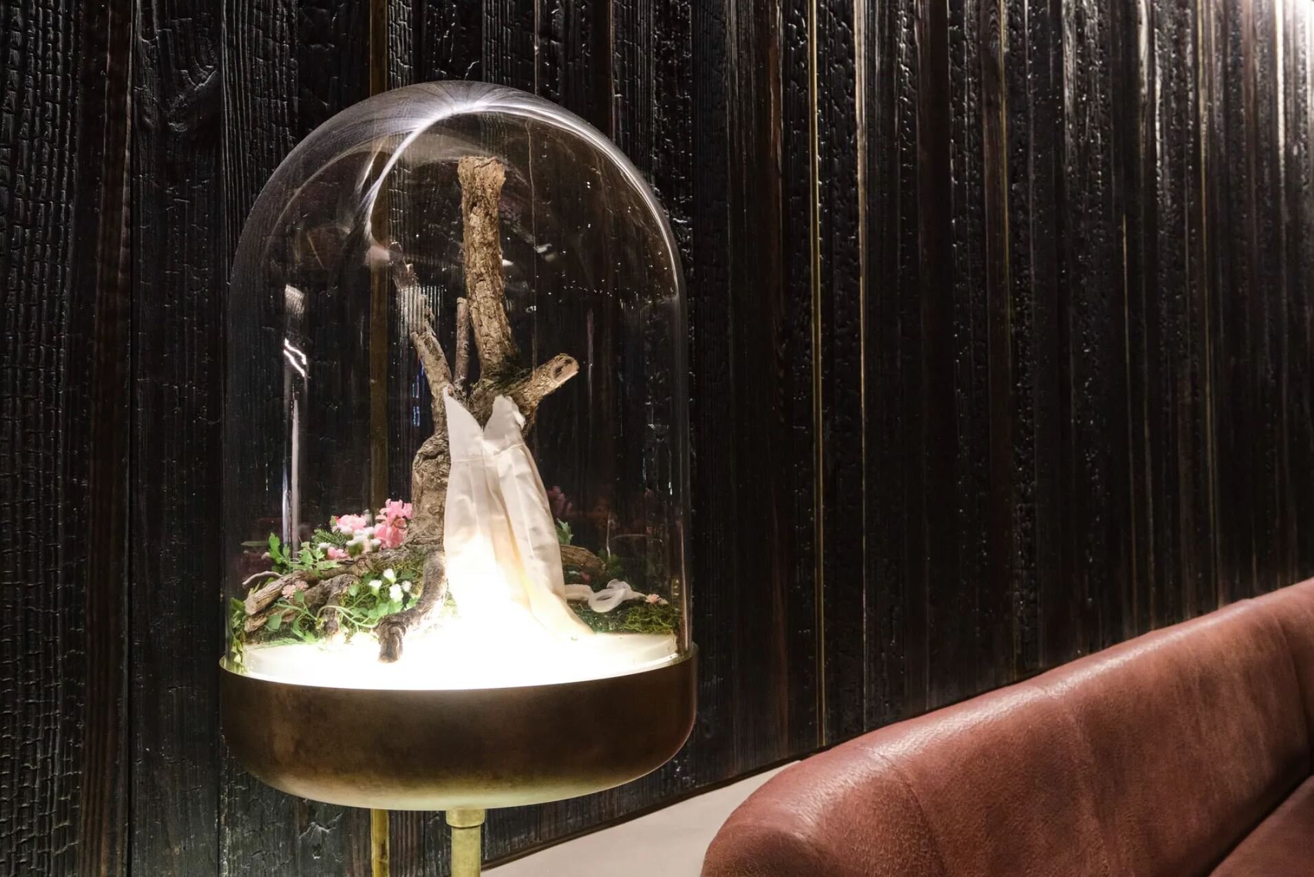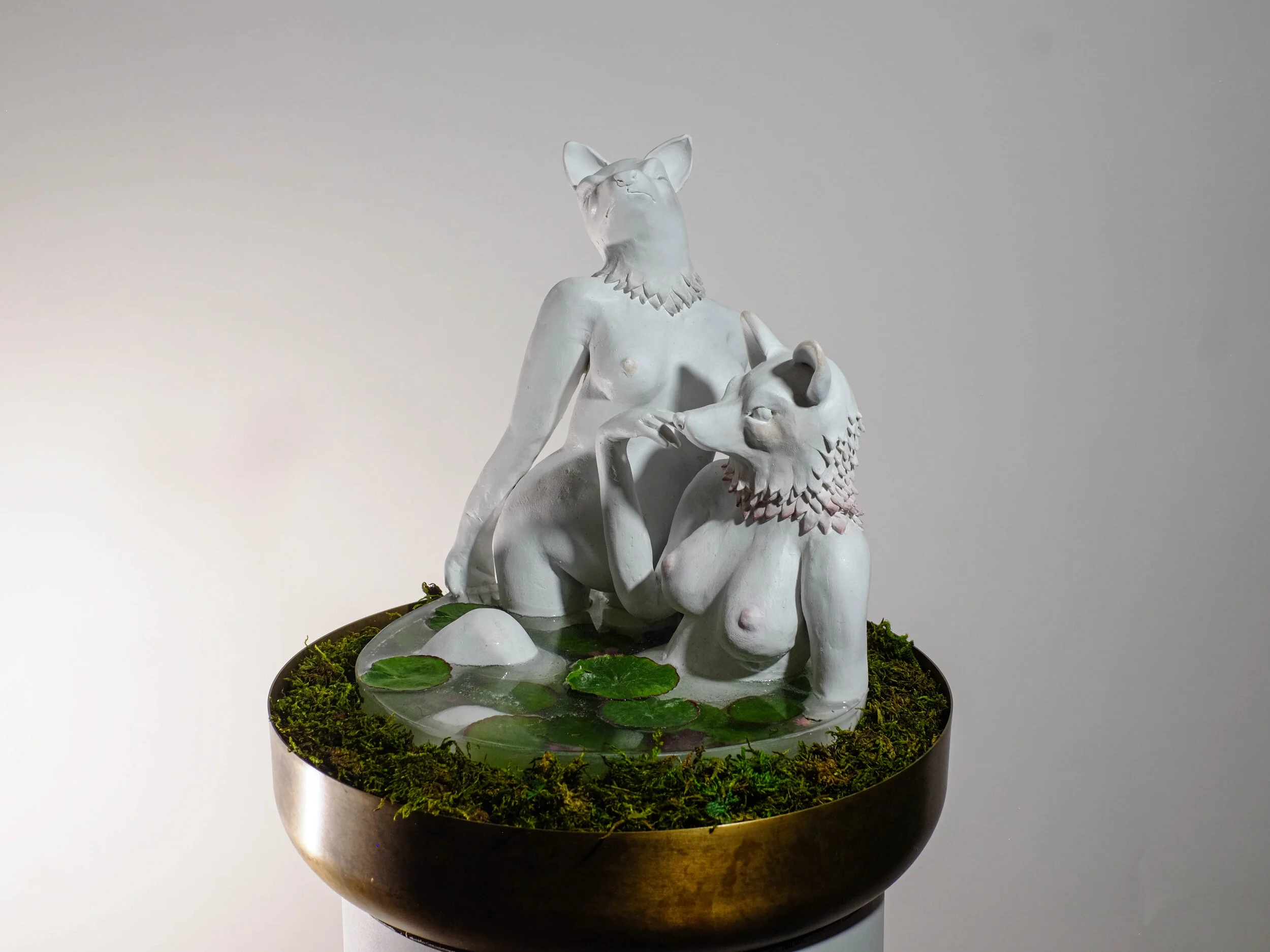 These sculptural pieces were conceptualized for MB Steakhouse in Las Vegas, based on the tradition joyous celebration at the summer solstice. Lush and erotic, these sculptures draw inspiration from kupala traditions such as releasing flower wreaths into rivers, dancing around bonfires, night time searches for the elusive fern flower, and purification through natural waters. These scenes speak of our deep connection to nature and the rituals that remind us to take joy in this connection. Each sculpture is approximately 12” x 15”, and is comprised of hand sculpted clay, flowers, foliage, resin, and LED lights set into a brass base and nestled under a glass cloche. Featured at One Steakhouse within the Virgin Hotel in Las Vegas.